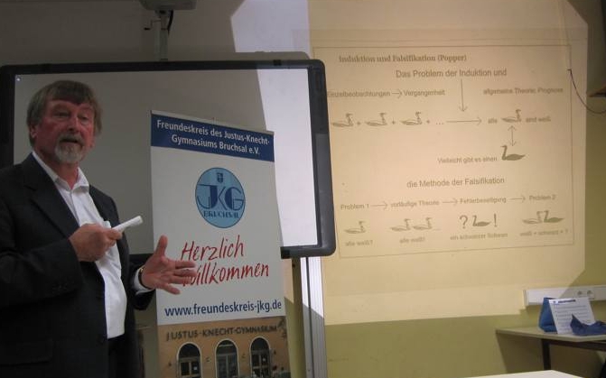 Karl Popper (1902–1994), österreichisch-britischer Philosoph jüdischer Abstammung gilt als Begründer des Kritischen Rationalismus und sagt, so führte der Referent aus, „wir können durch Induktion die Wahrheit nicht voraussagen“. Deshalb entwickelte Popper die „Falsifikationsmethode“, bei der es nicht darum geht, eine gute Theorie durch Induktion zu beweisen, sondern durch „Deduktion“ zu widerlegen. Den Zuhörern bleiben sicher die Beispiele der Schwäne in Erinnerung: Die Wahrnehmung noch so vieler weißer Schwäne kann nicht ausschließen, dass es auch schwarze Schwäne gibt.