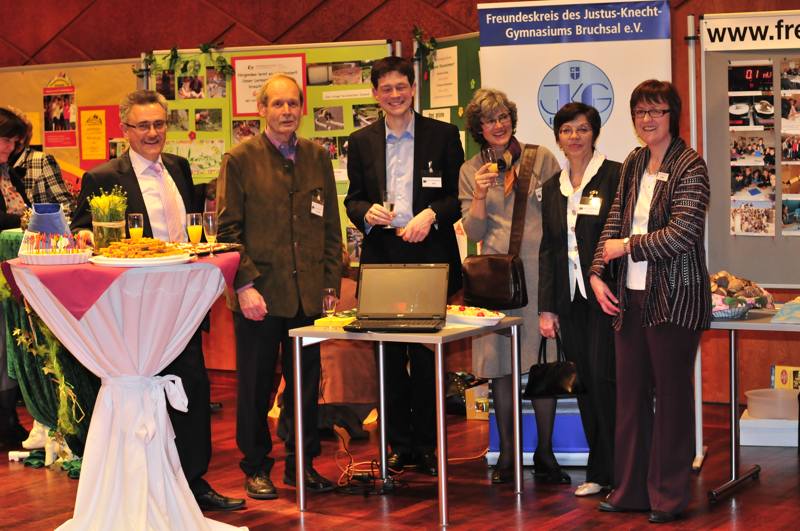 Auch der Freundeskreis des Justus-Knecht-Gymnasiums war eingeladen und nutzte die Gelegenheit, sich vorteilhaft darzustellen. Auf einer Fotowand wurden Beispiele von Projekten und Unterstützungsaktionen gezeigt, so unter anderem zum Austausch mit Israel und Rumänien oder bei Theateraufführungen, auf dem bereit gestellten Tisch konnte man Jahresberichte der Schule studieren und -nicht zu vergessen- es gab leckere Häppchen zu essen.