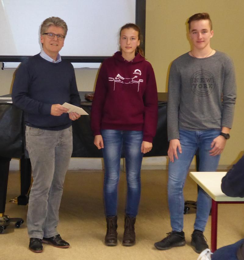 Es waren dies Julia Gräber mit einem Thema aus der Germanistik, 'Heldenkonzeptionen und -typen der höfischen Literatur des Mittelalters und der Moderne' und Anton Gramberg mit einem Thema aus der Astronomie 'Die Sonne - unser Stern‘. Als Anerkennung des Freundeskreises überreichte er Ihnen als Repräsentanten der Schule bei der Science Academy einen Mediengutschein (herzlicher Beifall).