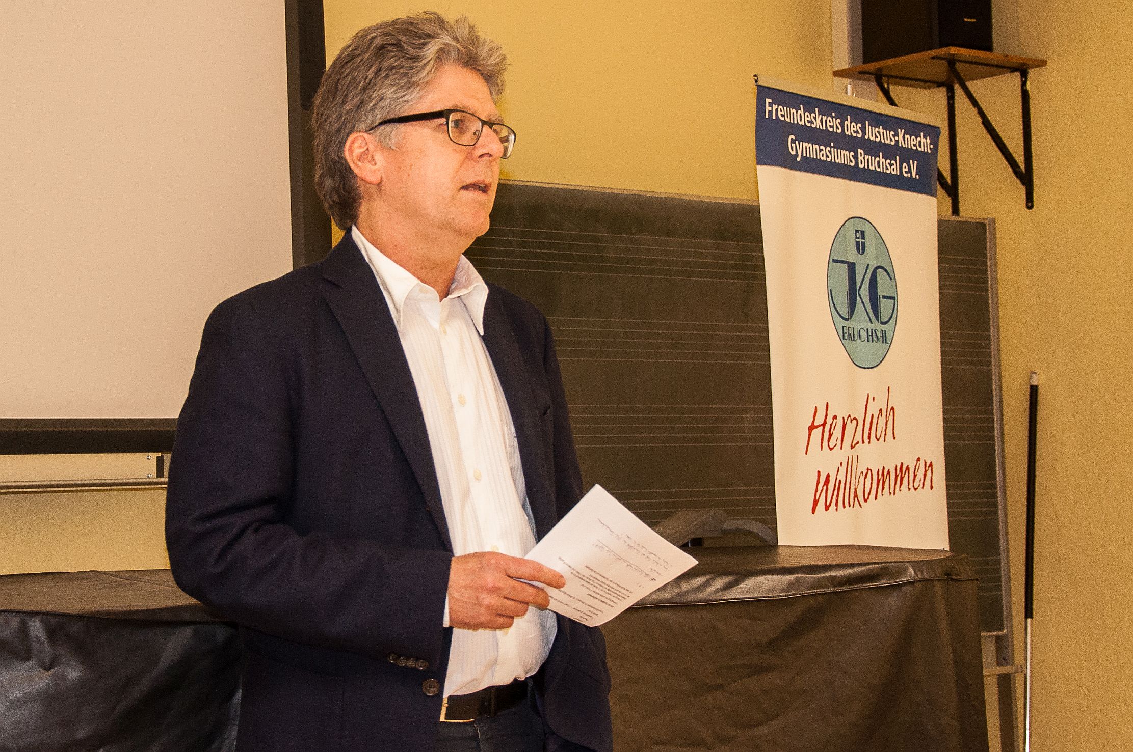 Der Vorsitzende Harald Eßwein begrüßte die anwesenden Mitglieder zur jährlich stattfindenden Mitgliederversammlung des Feundeskreises am JKG und blickte zunächst auf ein ereignisreiches Jahr zurück, das einerseits vom 125-jährigen Jubiläum der Schule geprägt war, aber auch andererseits zahlreiche Highlights mit interessanten Vorträgen und Exkursionen des Freundeskreises umfasste.