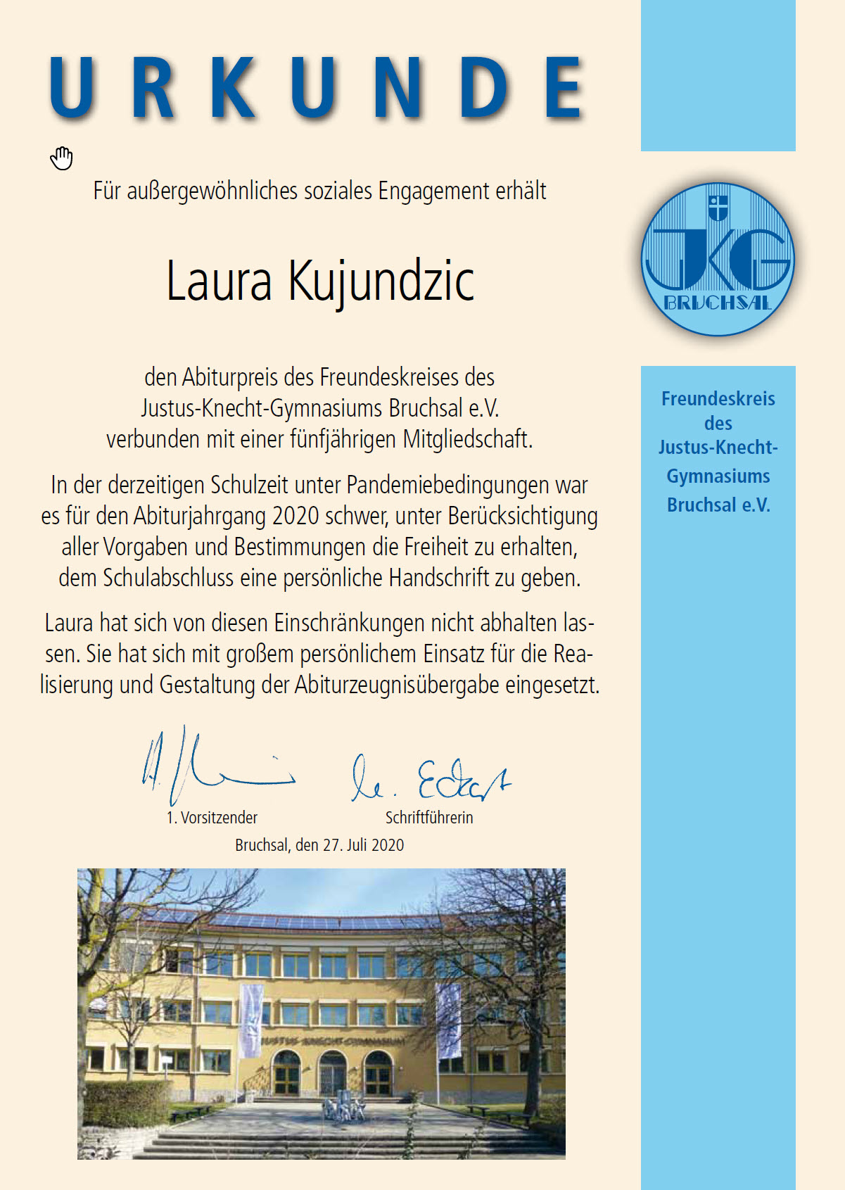 Ich glaube, jeder Abiturient und jede Abiturientin träumt von dem Abiball und wartet nur auf diesen Tag. Doch Corona hat uns alle Hoffnung auf einen Abiball genommen. Ich wollte diese Hoffnung aber nicht aufgeben und habe mich zusammen mit dem Abiball-Team darum gekümmert, dass zumindest eine kleine Feier stattfinden kann. Es gab viele Schwierigkeiten und wir waren uns bis zu dem Tag der Abifeier nicht zu 100% sicher, ob diese denn überhaupt stattfinden kann. Doch alle haben was zu dieser Abifeier beigetragen. Ob es ein früher Metroeinkauf ist (Grüße an Jenny, Laura, Assad und Elisabeth), zusätzliche Fotos (Danke an Emily), technische Dinge (die Informatiker wissen, dass ich sie meine) oder die Rolle als Stufenmama (natürlich Melissa) zu übernehmen, all das hat weitergeholfen. Deswegen geht der Sozialpreis nicht nur an mich, sondern an die ganze Stufe. Ich habe zwar die Organisation übernommen, doch hätte ich meine Helfer nicht, wäre auch die Feier nicht zustande gekommen. Vielen Dank an jeden einzelnen von euch! Ich werde die Zeit mit euch vermissen. Vielen Dank auch nochmal an die Schulleitung, an Herrn Fuchs und an Frau Gaag für die Hilfe und Unterstützung!